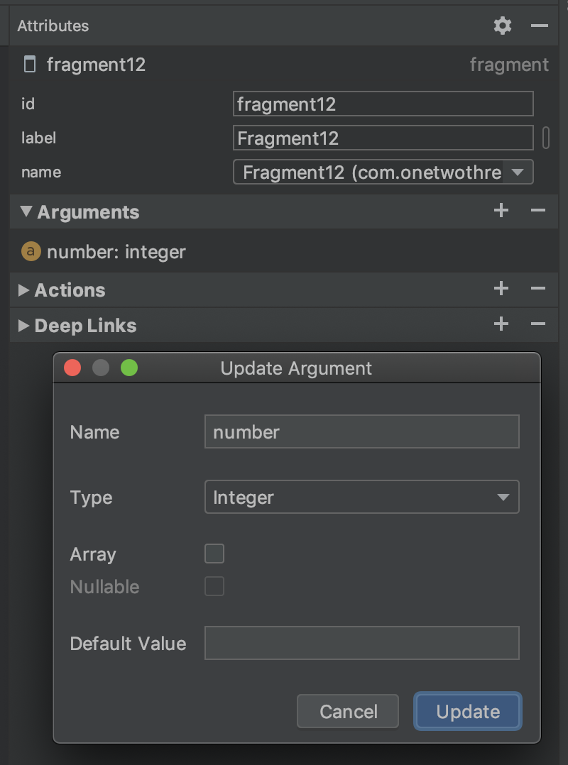 우선 Navigation 툴로 가서 프래그먼트가 받을 인자를 지정해 주어야 한다.