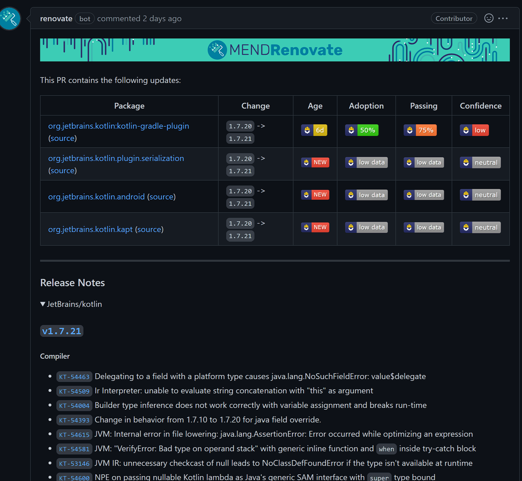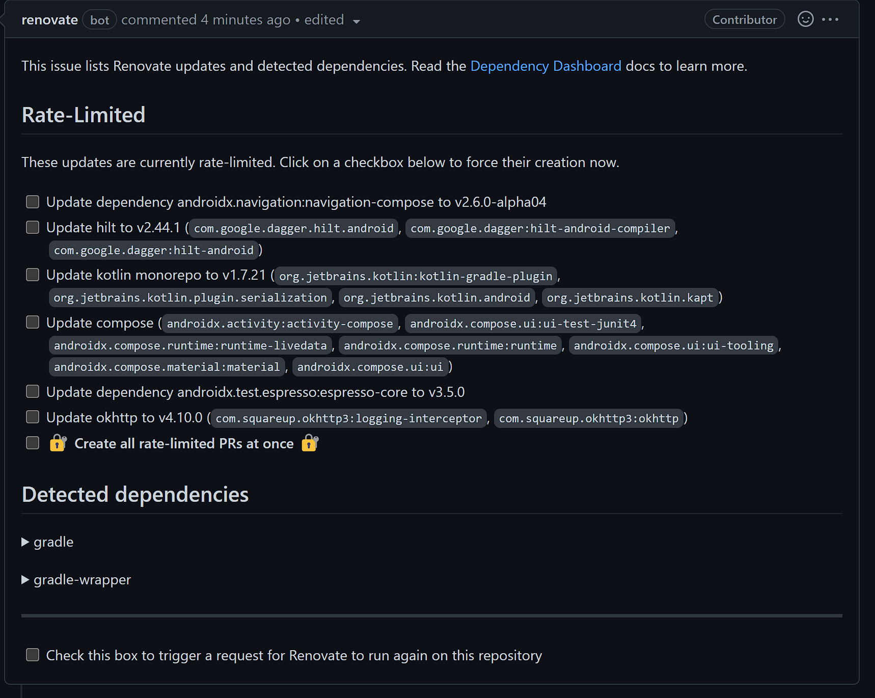 업데이트하기 싫은 라이브러리가 있는 경우 만들어진 pr을 닫아버리면 이렇게 이슈 화면에서 표시해주고, 더 이상 해당 라이브러리는 자동으로 pr을 날리지 않는다.
